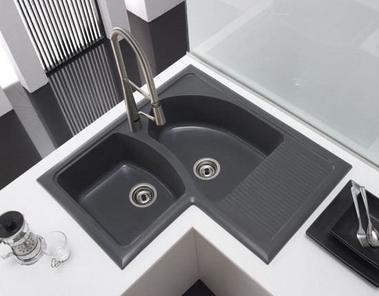 El fregadero Dédalo es un fregadero de dos cubeta y esquina para montaje sobre encimera . Se puede montar en muebles, con una anchura desde 90