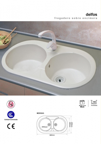 El fregadero delfos es un fregadero de dos cubeta y para montaje sobre encimera . Se puede montar en muebles, con