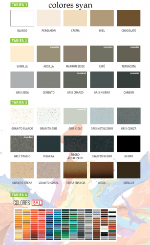 Se puede elegir entre 32 colores de la carta de colores Syan, clasificados en :