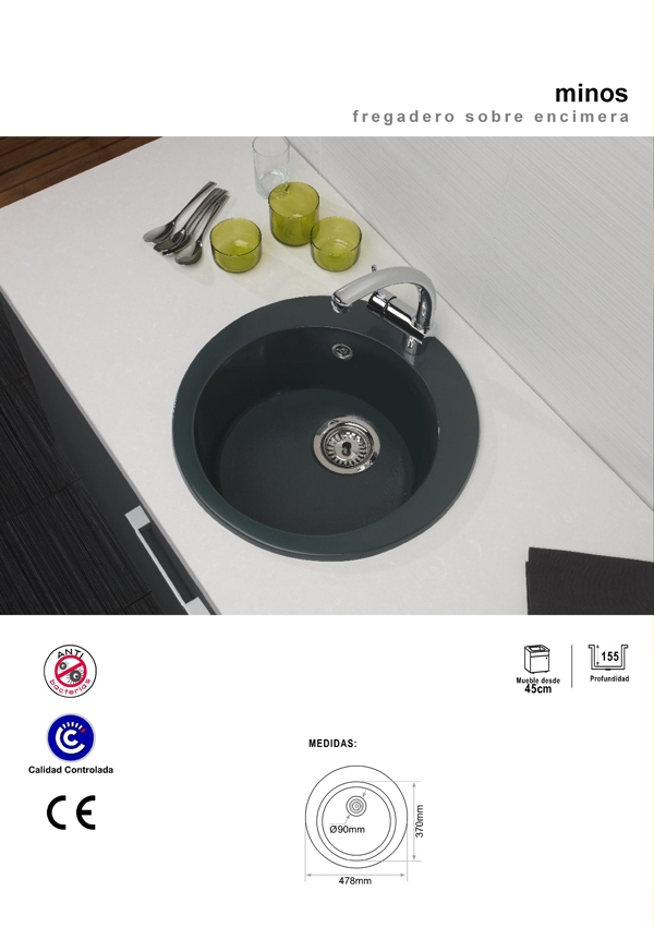 El fregadero minos es un fregadero de 1 cubeta para montaje sobre encimera o bajo encimera. Se puede montar en muebles, con una anchura desde 50 m , si se instala bajo encimera y en muebles con una anchura desde 80cm si se instala sobre encimera .La profundidad del fregadero es de 215 mm.