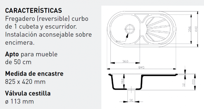 Fregadero curvo de una cubeta y escurridor reversible.