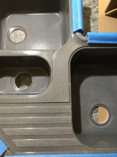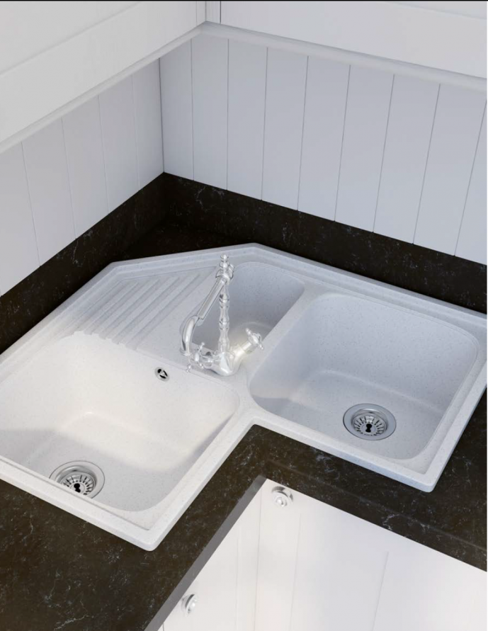 Fregadero angular con 2 cubetas, 1 pequeña lavaverduras y escurridor.