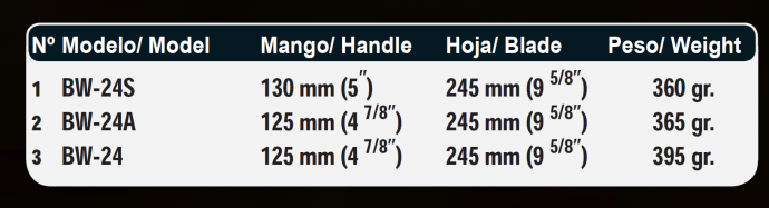 1 BW-24S, 2 BW-24A, 3 BW-24,Cuchillo de monte o machete de remate de Muela, mango de cuerno de ciervo y virola de acero, hoja de doble filo la virola es una cruceta con roseta , camara de aire, tipo acero molibdeno vanadio, remachado, tamaño hoja 250mm, mango 130mm, todo una pieza asta atras, con su funda de piel de primera calidad