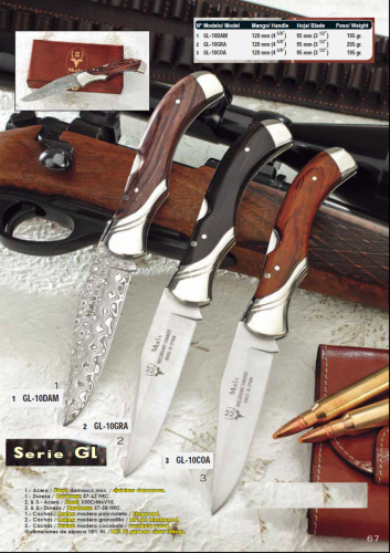 Navaja con cachas de asta de ciervo, alpaca con 18% Ni. Hoja de acero Damasco inoxidable, utilizando dos clases de acero pulvimetalúrgicos (RWL34 y PMC27) y unidos entre sí a 1150 °C y una presión de 1.000 atmósferas, se consigue un acero de una resistencia a la rotura dos veces superior así como también duplica la resistencia a la fatiga, la ductilidad y la tenacidad al impacto; además de una excepcional belleza en su grabado.