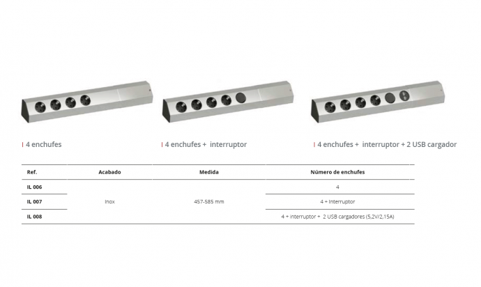 · Número de enchufes: 4 enchufes | 4 enchufes + interruptor | 4 enchufes + interruptor + 2 USB cargadores