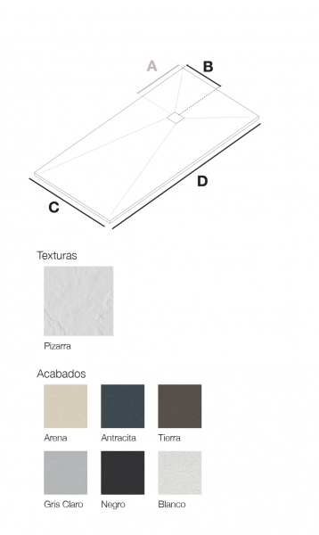 textura de la pizarra natural. Extraplano (3 cm de grosor) y con rejilla cuadrada de 4 planos de pendiente para un drenaje eficiente.