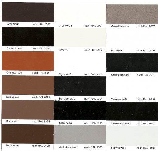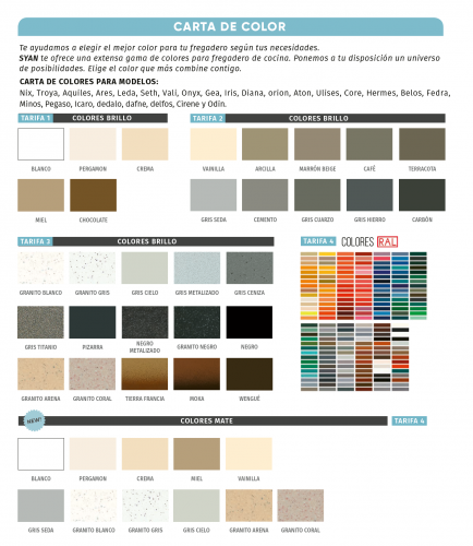 Se puede elegir entre 32 colores de la carta de colores Syan, clasificados en :