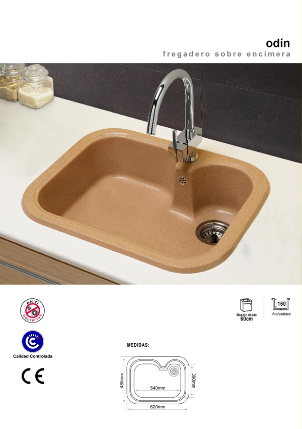 El fregadero Odin es un fregadero de dos cubeta para montaje sobre encimera . Se puede montar en muebles, con una anchura desde 60 cm . La profundidad del fregadero es de 160 mm.