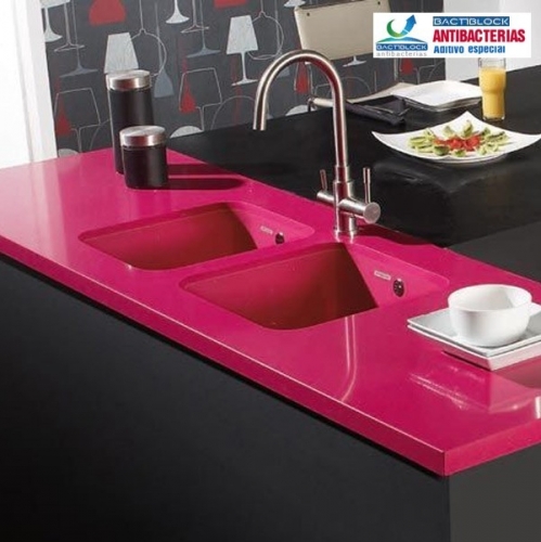 Estos fregaderos están fabricados sistema Roc_Stone con resinas y reforzados con cargas minerales naturales (cuarzos, sílices, alúminas), debido a estos materiales poseen propiedades antibacterias. además de facilitar la limpieza, ya que se puede usar productos anti calcáreos ,legía,e incluso acido Clorhídrico .