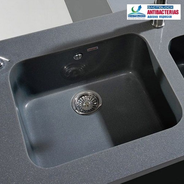 Estos fregaderos están fabricados con sistema ROC_STONE con resinas y reforzados con cargas minerales naturales (cuarzos, sílices, alúminas), debido a estos materiales poseen propiedades antibacterias. además de facilitar la limpieza, ya que se puede usar productos anti calcáreos ,legía,e incluso acido Clorhídrico .
