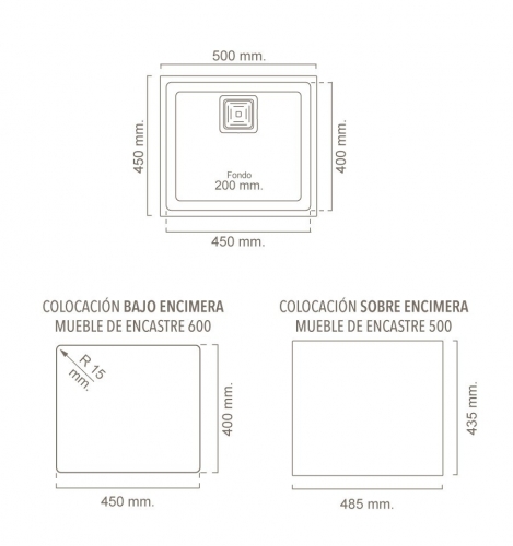 500X450X200mm, para mueble de 60cm, si se instala bajo encimera y para mueble de 50cm si instala sobre encimera.