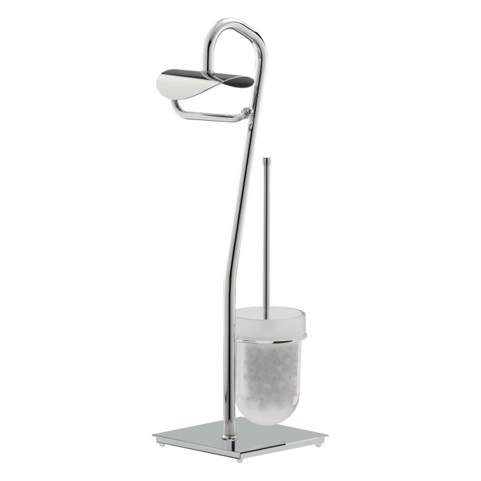 Escobillero con portarrollos con tapa de corte clásico. Los accesorios además tienen un estilo único, con las puntas en forma de