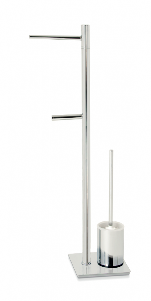 Escobillero con portarrollo y tollero de bidé giratorio, de esta manera se pueden orientar la barra del portarrollo donde se desee, ocupando el mínimo espacio.