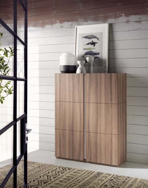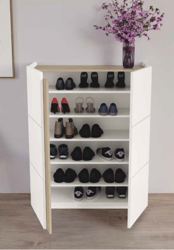 Zapatero sencillo y práctico fabricado en melamina. Dispone de 2 puertas que sobresalen