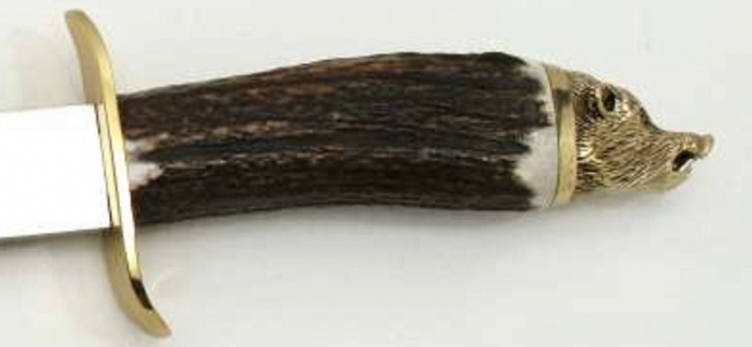 Cuchillo de remate con puño de asta de ciervo con cabeza de jabali y defensa de latón.