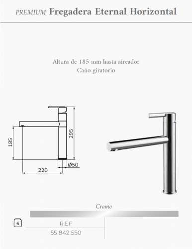 Grifería de cocina Grober Eternal Horizontal monomando para fregadera, caño giratorio, acabado cromado