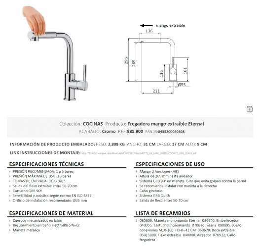 GRB Eternal Boca Extraíble caño Forma grifo fregadero monomando