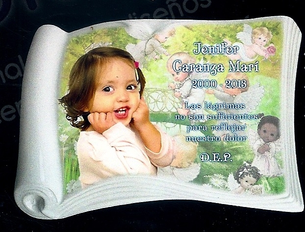 Pergamino de Cerámica, con los bordes en relieve , para crear el mejor recuerdo de tu ser querido, realizado con los últimos sistemas de impresión y modulación, resistentes a las inclemencias del tiempo, consiguiendo así que perdure como nuevo durante muchos años.
