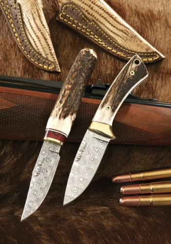 Cuchillo enterizo con cachas de asta de ciervo y latón. Hoja de acero de Damasco inoxidable, utilizando dos clases de acero pulvimetalúrgicos (RWL34 y PMC27) y unidos entre sí a 1150 °C y una presión de 1.000 atmósferas, se consigue un acero de una resistencia a la rotura dos veces superior así como también duplica la resistencia a la fatiga, la ductilidad y la tenacidad al impacto; además de una excepcional belleza en su grabado.
