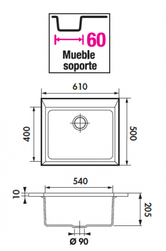 Dimensiones (mm): 610 Largo x 500 Ancho x 205Profundo