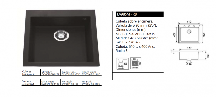 Medidas de encastre: 590 x 480 mm (R=5)