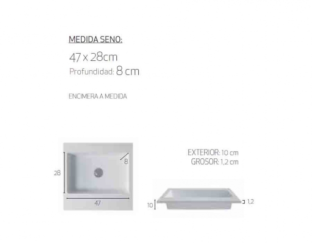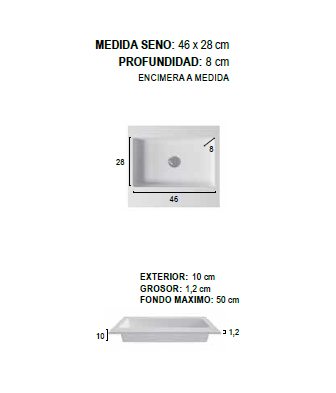 La cubeta tiene una medida de 47x28x8 cm, se puede hacer centrada, o desplazada,(con el mismo precio) o con doble cubeta, la medida de la cubeta no se puede variar.