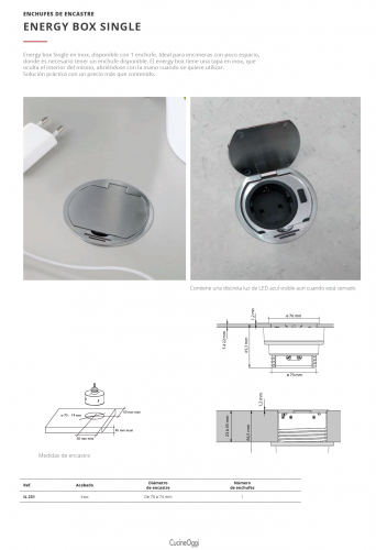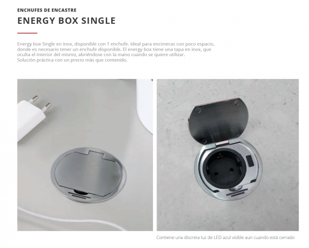 Nuevo Energy Box Single en inox, disponible con 1 enchufe o con 1 enchufe más 1 USB cargador. Ideal para encimeras con poco espacio, donde es necesario tener un enchufe disponible. El energy box tiene una tapa en inox, que oculta el interior del mismo, abriéndose con la mano cuando se quiere utilizar. Solución práctica con un precio más que contenido.