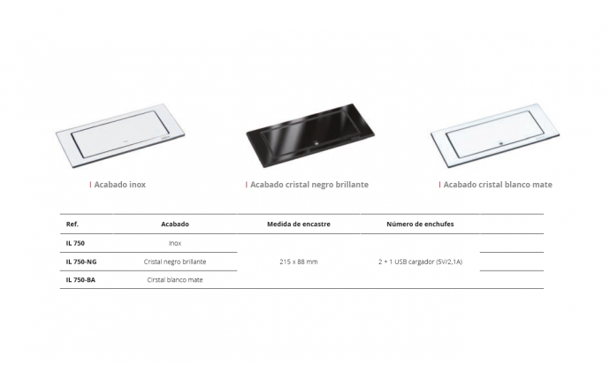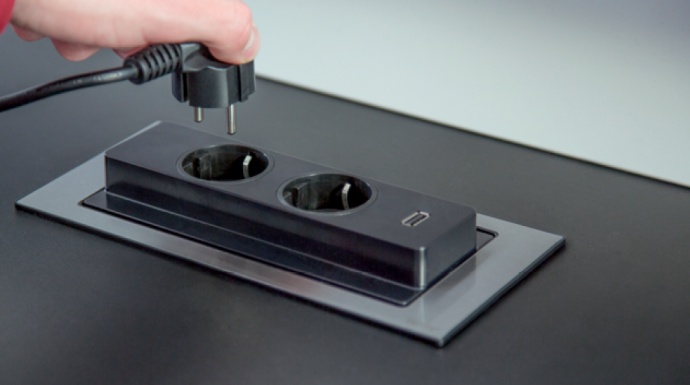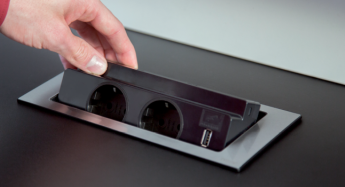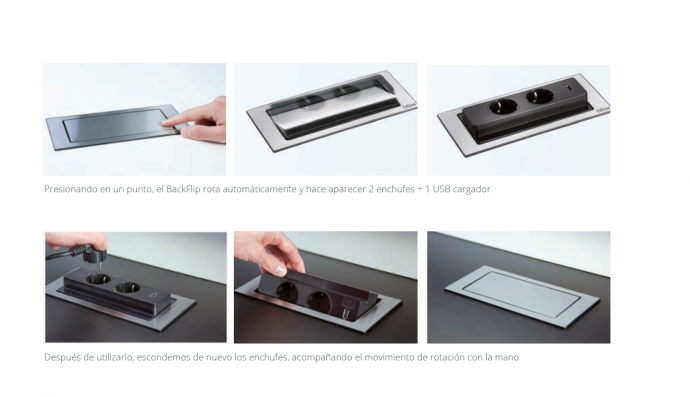 Nuevo Energy Box BackFlip con 2 enchufes y 1 USB cargador en terminación inox. Ideal para encastrar en prácticamente todas las encimeras, puesto que sólo tiene 53 mm de profundidad. Sólo presionando en un punto del BackFlip cuando está cerrado, aparece el energy box listo para ser usado.