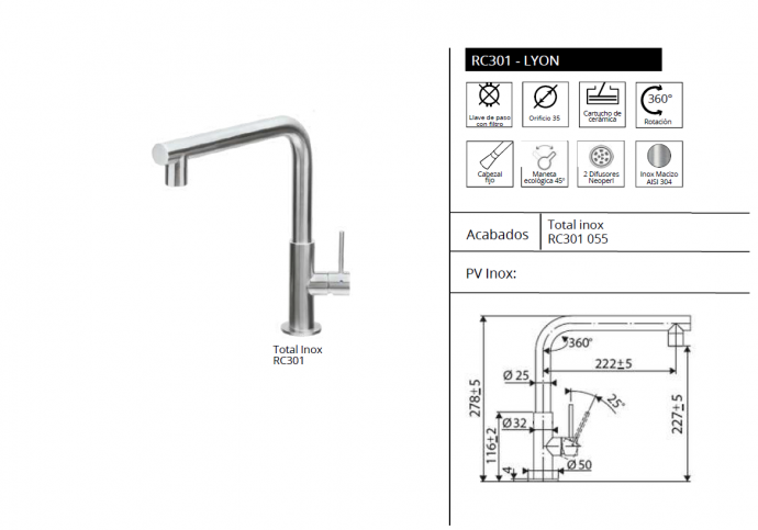 Descripción: Grifo monomando de cocina Total Inox con caño alto