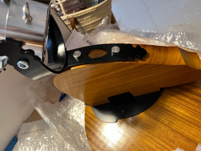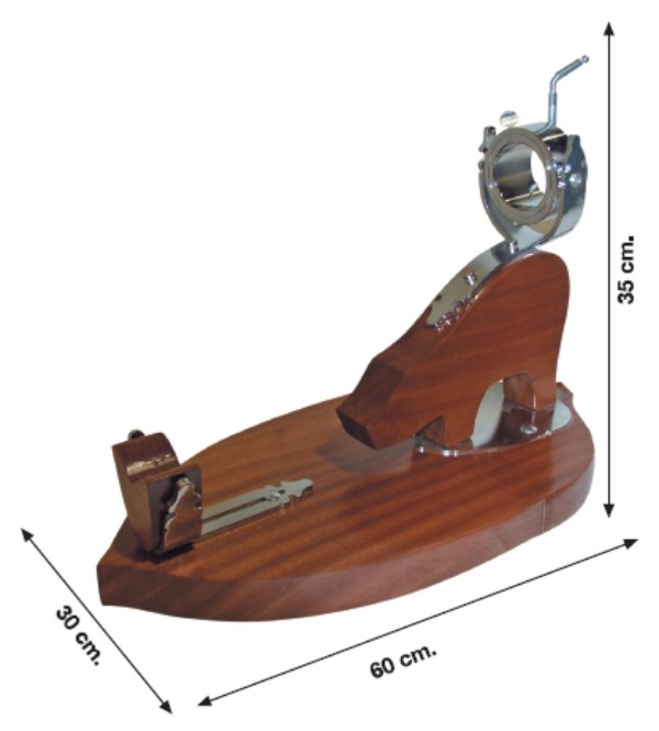 Soporte jamonero giratorio de primera calidad acabado en madera de Sapelly. La base del jamonero tiene la forma de una bellota, el soporte para la pata de jamón va sujeto a la base por una pletina negra con la forma de una bellota, además incluye una "v" corredera que se puede fijar en varias posiciones, según sea el tamaño del jamón.