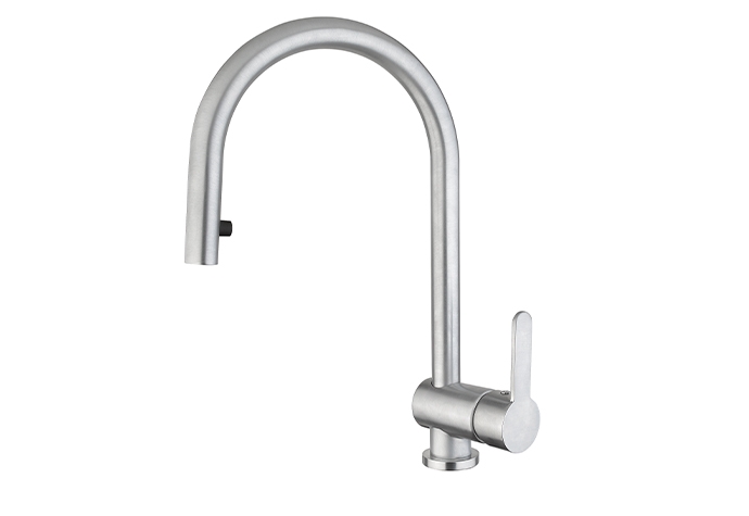 Monomando cromado extraíble con caño pivotante y salida soble jet.