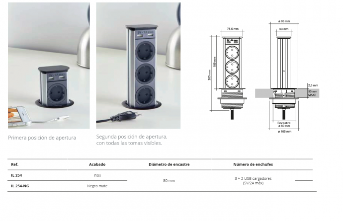 La nueva versión del Escamoteable Basic, es el Escamoteable Basic 2.0, Energy Box con 3 enchufes y 2 tomas USB cargadores disponible tanto con tapa en inox como con tapa en negro. El escamoteable tiene 2 posiciones de apertura, una primera donde queda visible y apto para su uso 1 enchufe y los 2 USB, y una segunda donde se muestran la totalidad de las tomas de enchufes.