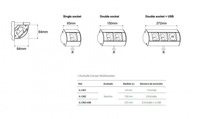 es cómodo y versátil. Disponible en acabado aluminio con 1 enchufe, 2 enchufes o 2 enchufes +