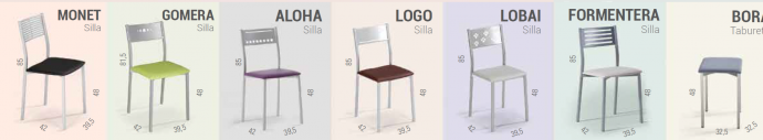 Sillas y taburetes: se puede elegir los modelos:, Formentera, Logo, Aloha Y Belice, con estructura metálica