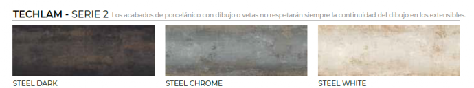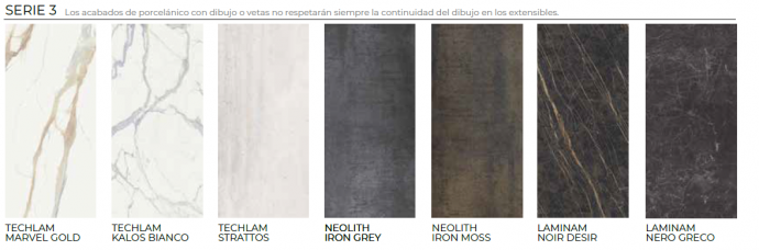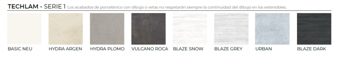 Encimera y extensibles: en el mismo material que la encimera principal, cristal templado de seguridad de 8 mm o porcelánico.