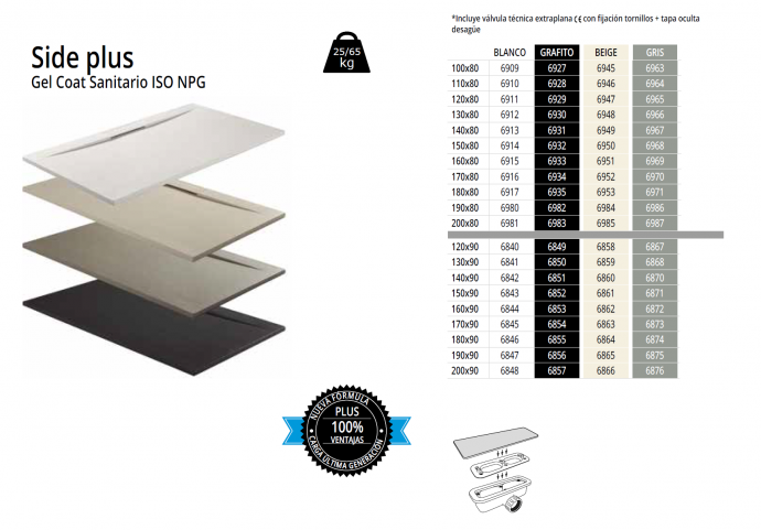 Side Plus está fabricado en resina con una nueva fórmula de carga mineral y Gel Coat sanitario ISO NPG de última generación que nos