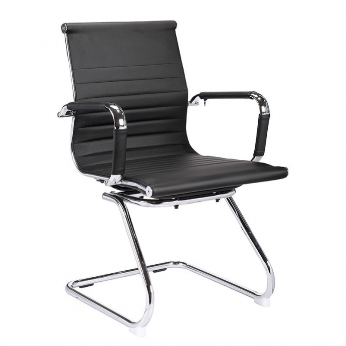 Silla fija fabricada con estructura de metal resistente de alta calidad acabado en cromo brillo y asiento de polipiel con reposabrazos.