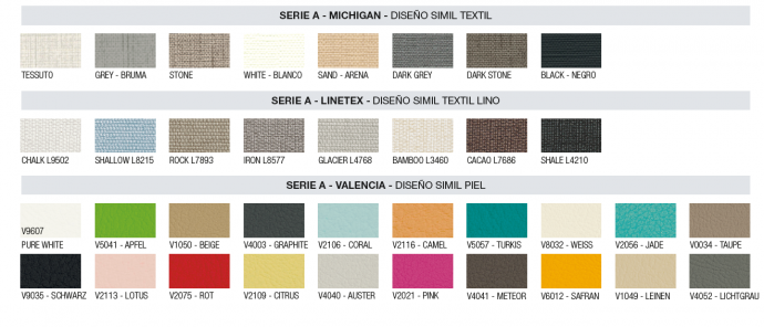 Chasis y patas: Tubo acerado pintado en Plata, Blanco Negro, y Antracita Patas de 5x5 cm.