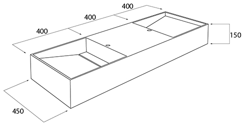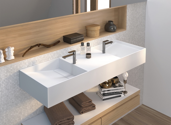 Lavabo con faldón, fabricado en Iron Solid Surface (Krion K-Life), un material innovador hecho con alto porcentaje de minerales naturales y mínima