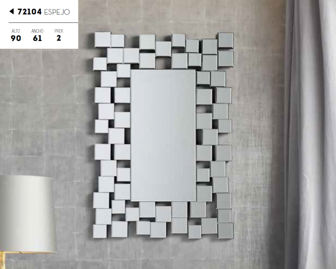 Espejo rectangular con un marco compuesto por pequeños cuadrados, todos con acabado espejo, que