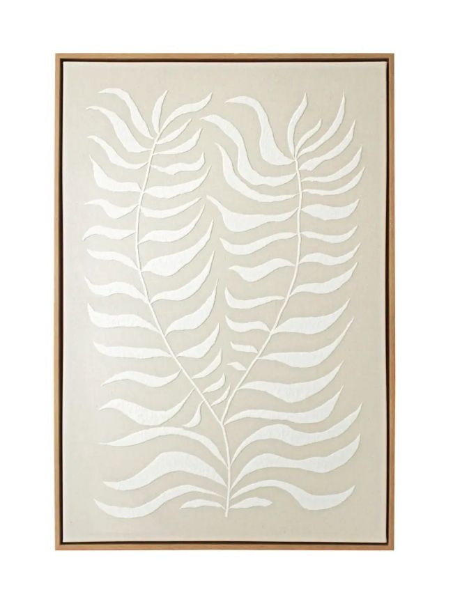 Lienzo de lino con un diseño abstracto en relieve blanco, fabricado en poliuretano. Su marco en