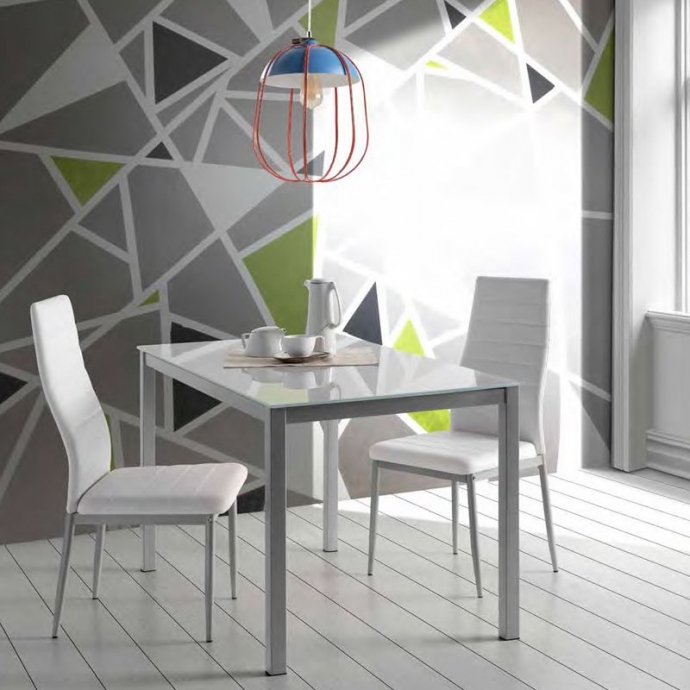 Mesa de cocina con tapa superior rectangular de cristal templado blanco y estructura con patas de