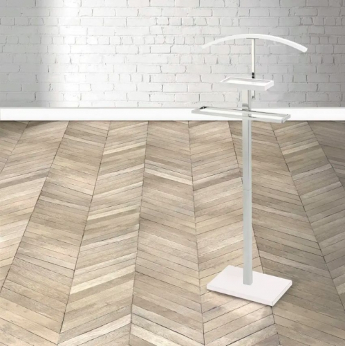 Galán de noche en metal con detalles en madera lacada en blanco. Diseño sencillo y moderno, perfecto