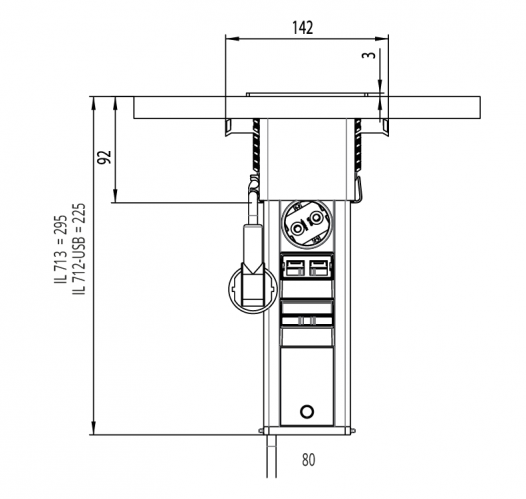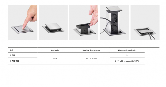 la superficie. Disponible con tapa en acabado inox, con 3 enchufes o 2 enchufes + 1 USB cargador.