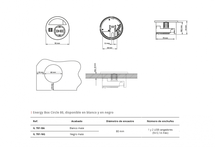 modernos. El energy box consta de 1 enchufe, 2 USB cargadores, y un hueco