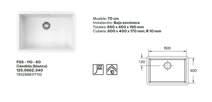Cubeta: 600 x 400 x 170 mm; R 10 mm