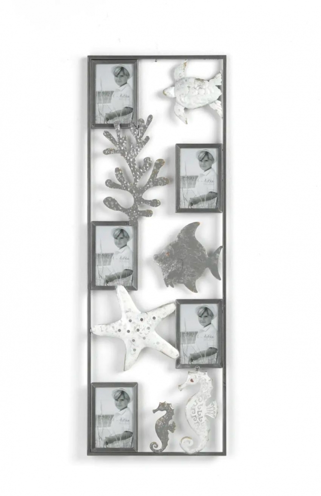 Estructura metálica rectangular en tonos grises con temática marina. Incluye 5 portafotos. Ideal para