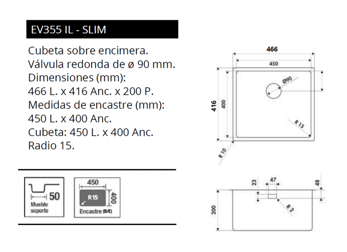 encastre sobre la encimera. Dispone de grapas de sujeción para una perfecta fijación a la encimera.
