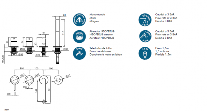 Monomando de Bañera para instalar en el Borde de la bañera.