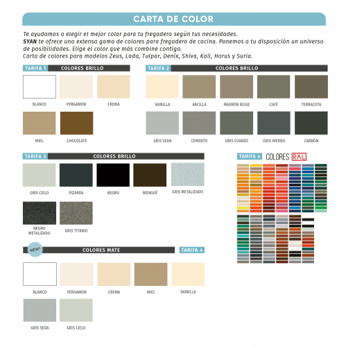 Vainilla, Arcilla, Marrón Beig, Café, Terracota, Gris Seda, Cemento, Gris Cuarzo, Gris Hierro, Carbón